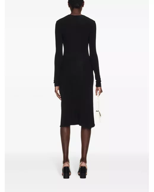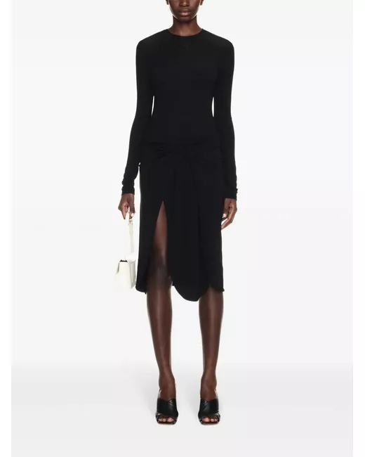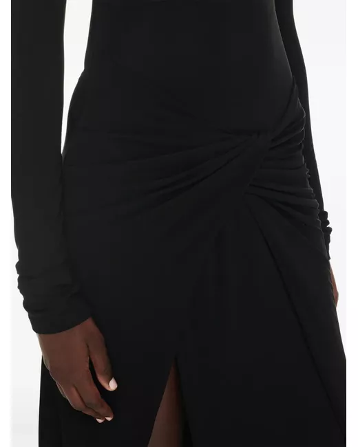 Nero, trama effetto crêpe, design elasticizzato, collo alto, maniche lunghe, stampa con logo frontale, design attorcigliato, taglio nella parte anteriore e lunghezza sotto al ginocchio.