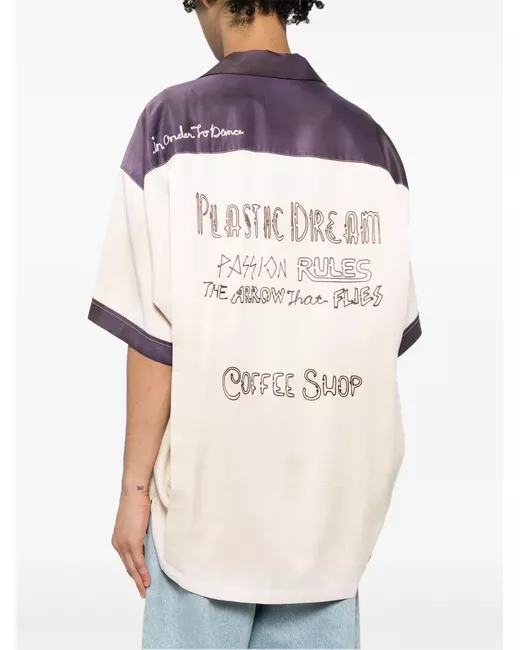 bianco crema/viola misto cotone design color-block ricamo con slogan applicazione con logo colletto alla francese abbottonatura frontale maniche corte due tasche applicate sul petto orlo asimmetrico