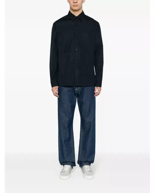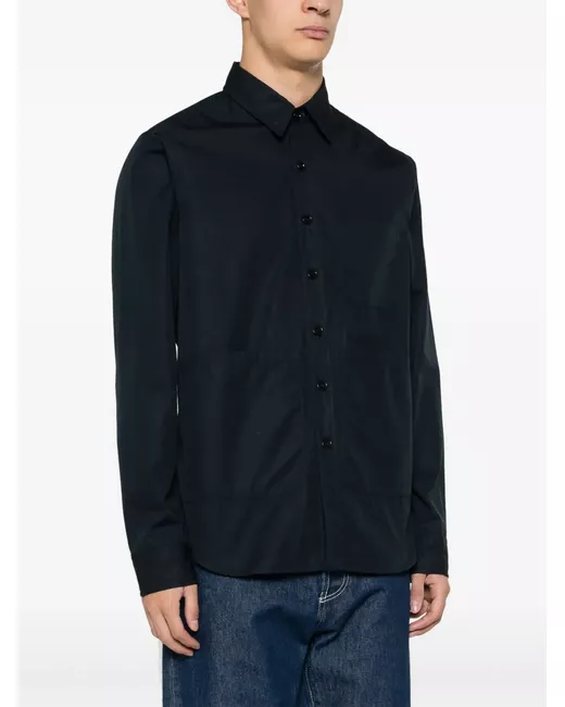 midnight blue cotton poplin texture straight-point collar long sleeves buttoned cuffs chest patch pocket two front patch pockets front button fastening curved hem unlined