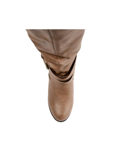 Step into trend-setting style with these buckle boots by Journee Collection. These fashionable boots feature premium faux leather uppers that rise mid-calf with slightly raised angular vamps in the front.