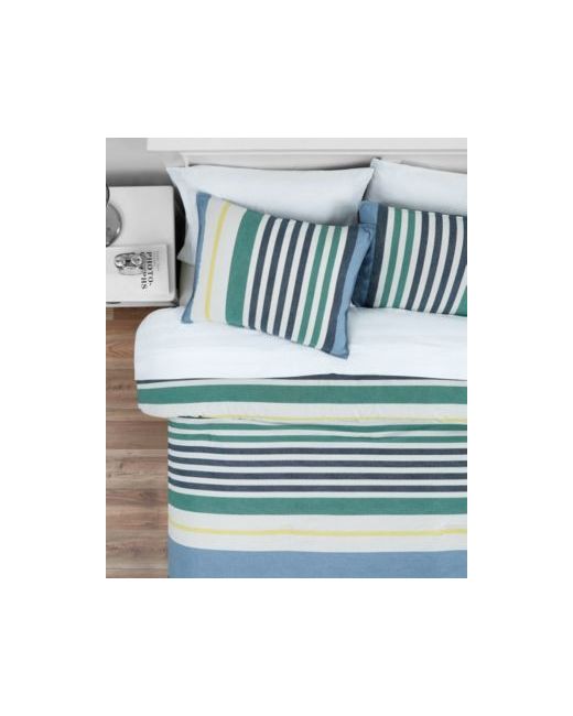 This high impact stripe is crisp and refreshing in an appealing multicolor palette of navy, chambray blue, and white with fashion accents of yellow and sea glass green. Made of durable cotton, this set is pigment printed for fresh color that lasts.