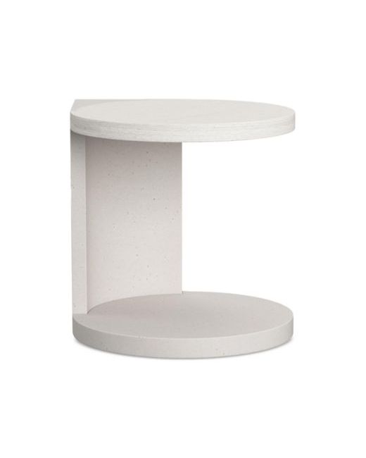 The Stratum side table creates a modern geometric style with a curved top and shelves that are bisected a straight center panel and back, all in Mist finish.