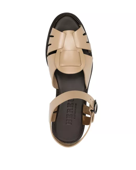 sand beige calf leather round open toe interwoven design cut-out detailing branded footbed suede lining flat leather sole buckle-fastening ankle strap