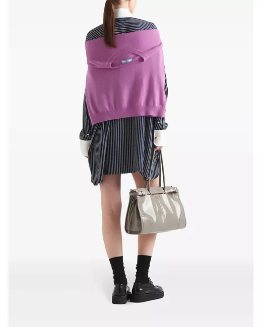 blu navy/beige chiaro/bianco seta trama effetto crêpe motivo a righe verticali colletto button-down maniche lunghe polsini con bottone tasca applicata sul petto triangolo in smalto con logo dettaglio con pieghe a cannone etichetta interna con logo orlo dritto bottoni color oro chiusura frontale con bottoni