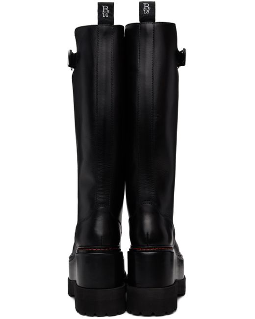 Calf-high grained leather boots in black. · Square toe · Logo patch at vamp · Grosgrain pull-loop at collar · Pin-buckle tab at outer side · Serrated detailing at welt · Covered platform midsole · Treaded rubber sole · Contrast stitching in orange · Platform: H3 · Heel: H4 Supplier color: Black