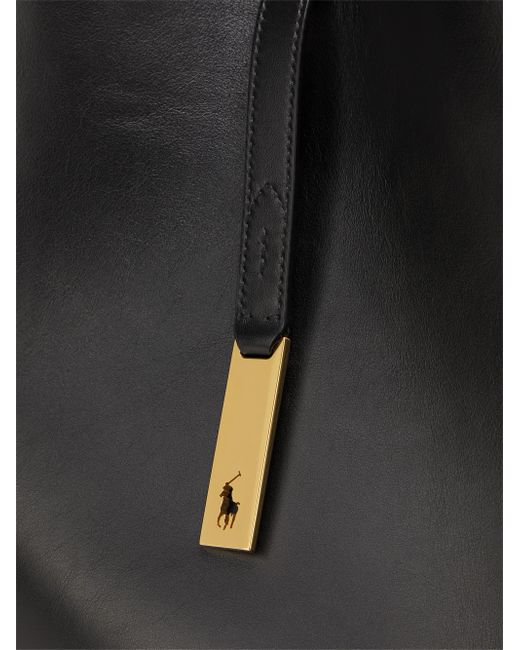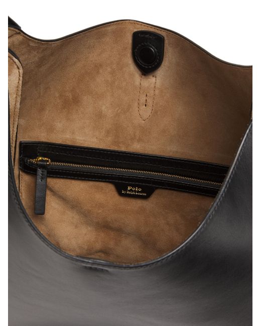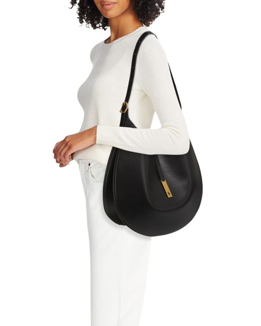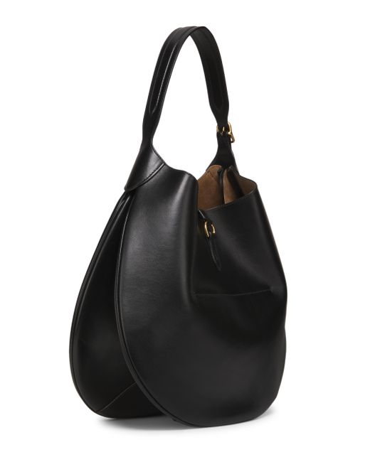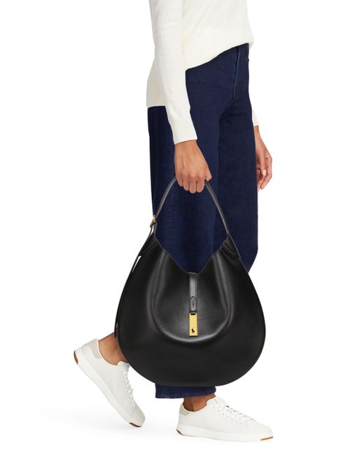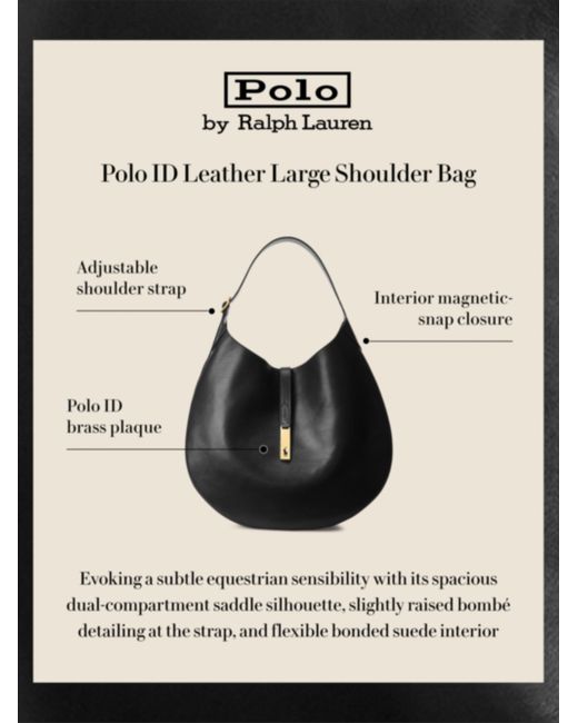This Large Polo ID leather shoulder bag from Polo Ralph Lauren evokes a subtle equestrian sensibility. The saddle silhouette is designed with bombé detailing at the strap and a hutton brass buckle. Adjustable shoulder strap Interior: one zip pocket and two compartments Magnetic closure Leather Lining: suede Imported SIZE About 15.5"W x 14"H x 3.75"D Adjustable shoulder strap: about 14.5"L. Handbags - Contemporary Handbags > Polo Ralph Lauren > Saks Fifth Avenue > Barneys. Polo Ralph Lauren. Color: Black.
