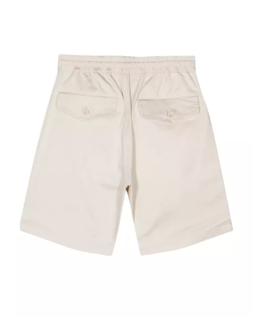 beige cotton-lyocell blend elasticated drawstring waistband straight leg two side slit pockets two rear button-fastening flap pockets straight hem above-knee length