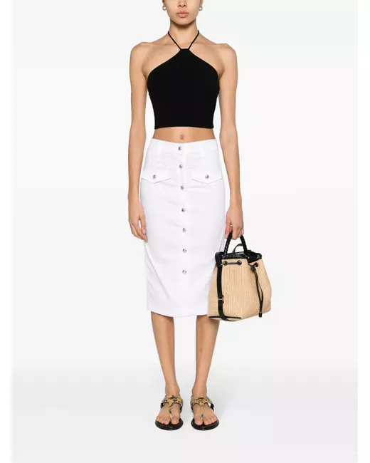 white cotton blend twill weave silver-tone hardware mid-rise concealed front button fastening belt loops two front button-fastening jetted pockets two rear button-fastening pockets front slit unlined straight hem