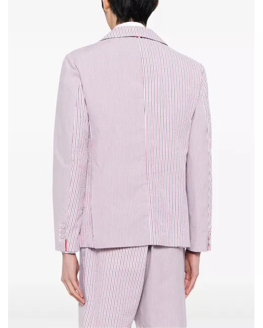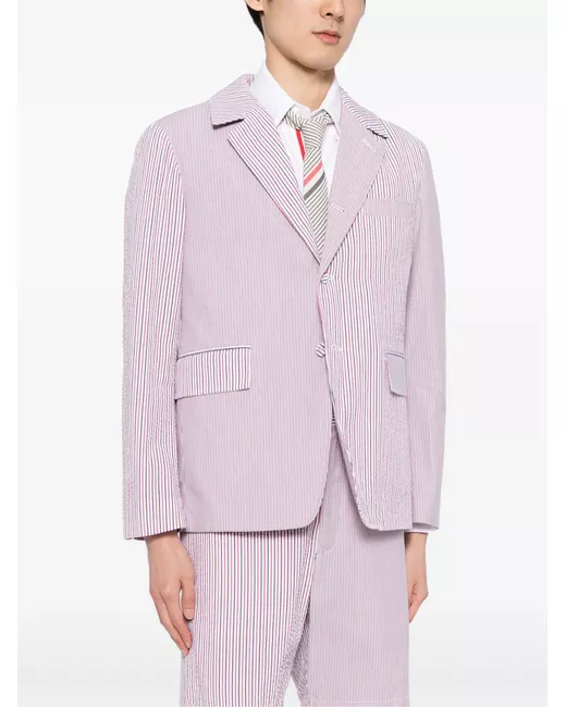 clay red/chalk white/anthracite grey cotton vertical stripe print notched collar front button fastening long sleeves buttoned cuffs chest welt pocket two side flap pockets English rear vents partial lining