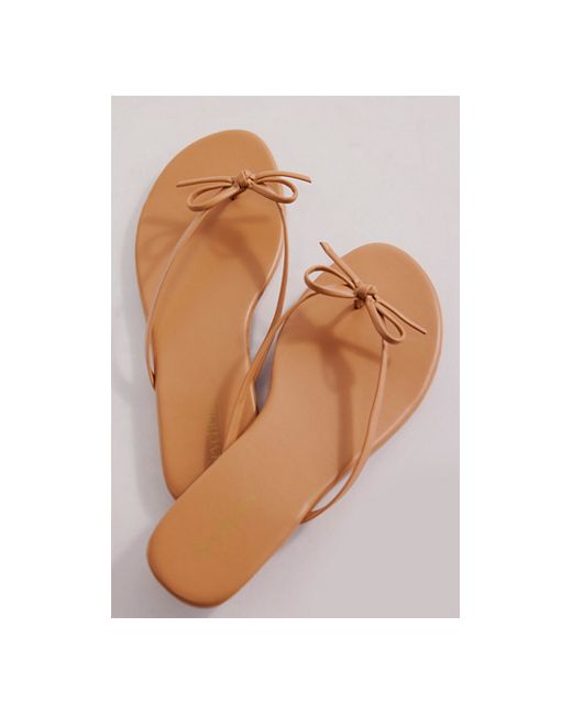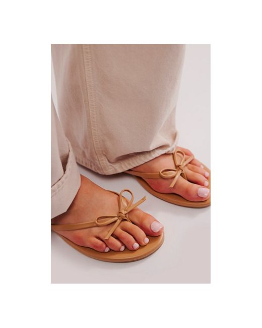 A staple sunny-day style gets a femme touch with these flip-flops from Seychelles, featured in a monochrome, vegan leather style with a dainty bow detail for the perfect added accent. **Features:** Slip-on style, backless design, vegan leather uppers, round open toe, thin thong straps, bow detail, flat sole **Why We Miley Bow Sandals by Seychelles at Free People in Tan, Size: US 7.5