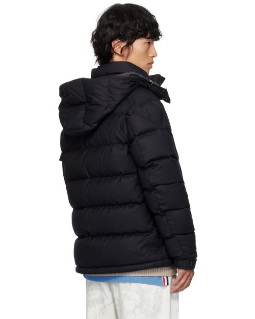 DIST-certified down-filled quilted virgin wool flannel jacket. · Bungee-style drawstring at detachable hood · Stand collar · Two-way zip closure · Zip pockets · Bungee-style drawstring at hem · Flap pocket and felted logo patch at sleeve · Adjustable press-stud tab at elasticized cuffs · Zip pocket at interior · Full quilted nylon léger lining Supplier color: Navy blue Fill: 90% goose down, 10% feather.