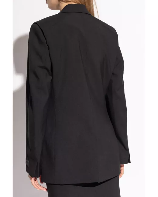 black virgin wool notched lapels button fastening two side flap pockets logo patch at the sleeve long sleeves straight hem