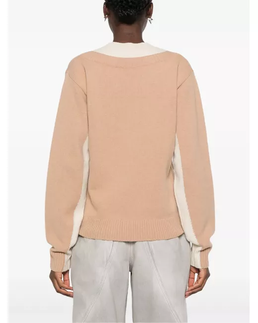 beige/brown wool-cashmere blend fine knit layered and two-tone design lurex detailing crew neck long sleeves silver-tone logo plaque ribbed cuffs and hem