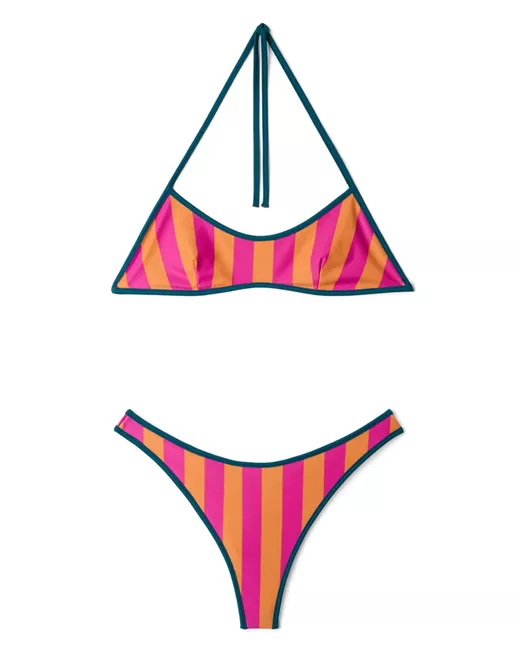 Petrol green/pink/orange stretch-design reversible vertical stripe pattern Top: halterneck tie fastening V-neck Bottom: thong strap logo stamp to the rear Be mindful to try on swimwear over your own garments.