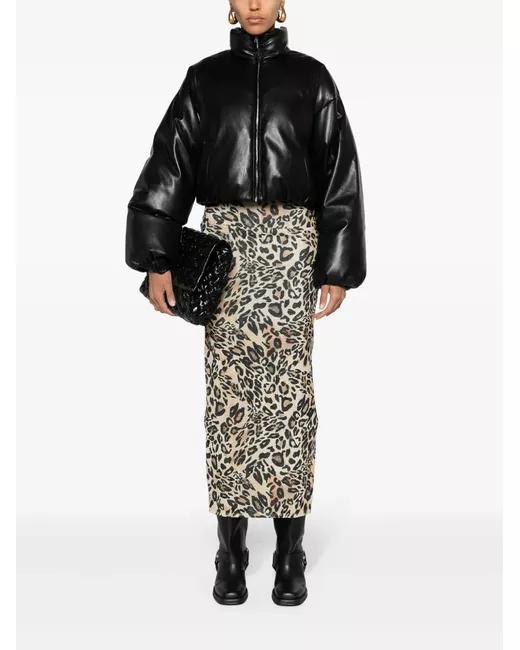 black faux leather grained texture padded design high neck front zip fastening long sleeves with elasticated cuffs two side slit pockets cropped straight hem full lining