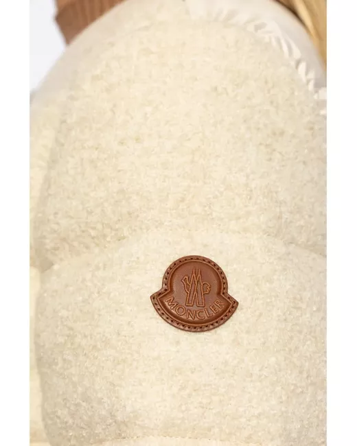 beige wool blend down-feather filling quilted padded panels crew neck contrasting border long sleeves logo patch at the sleeve two side welt pockets straight hem front two-way zip fastening