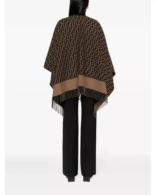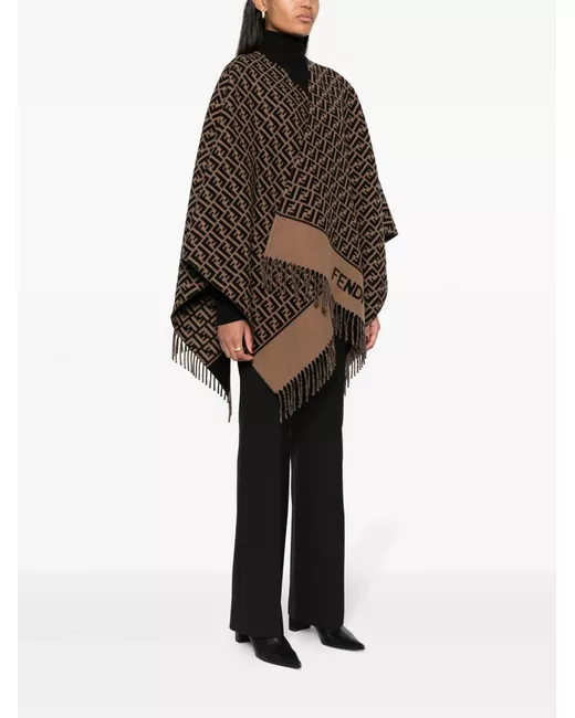 tobacco brown/camel brown virgin wool-cashmere blend FF-logo print cape design fringed edge open front