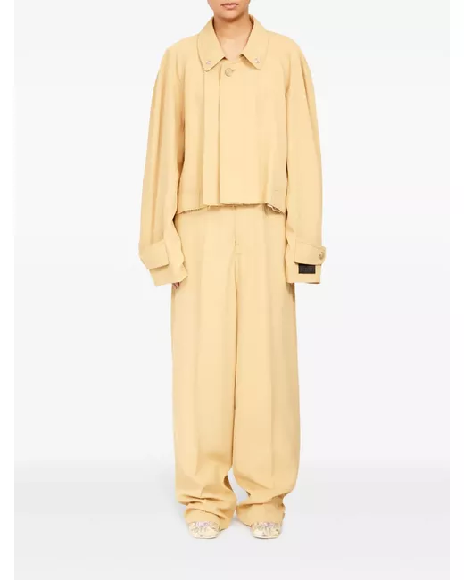 butter yellow logo patch at the sleeve raw-cut hem spread collar front button and zip fastening drop shoulder long sleeves belted cuffs cropped curved hem