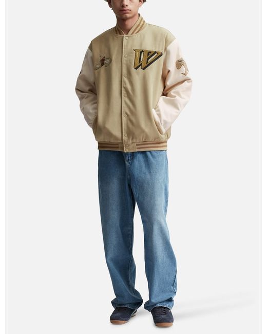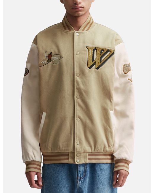 Walker Golf ThingsSandbelt Varsity JacketAcrylic felt exteriorFelt appliqué patches on front, sleeves and backFront snap button closureStriped ribbed collar, cuff, and hemQuilted liningColor: Sand/ Ivory