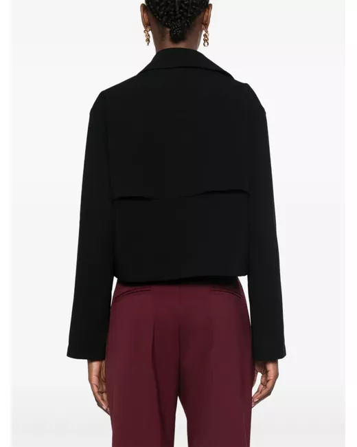 black crepe texture cropped double-breasted button fastening internal drawstring fastening waist peak lapels long sleeves rear storm flap satin lining