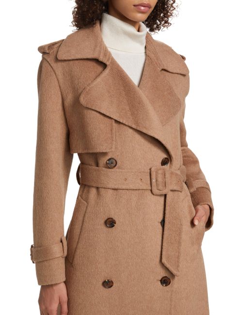 Designed with a double-breasted silhouette, this SIMKHAI Rumi coat is crafted of a wool blend and features trench styling and a belted waist. Point collar Shoulder epaulettes Long sleeves, belted cuffs Belted Side welt pockets Storm flap Dual side vents Double-breasted button closure 50% wool/50% polyester Lining: 100% polyester Dry clean Imported SIZE & FIT About 53.5" from shoulder to hem Model measurements: 5'10" tall Model is wearing a US size Small. Contemporary Sportswear - Workshop > Simkhai > Saks Fifth Avenue > Barneys. SIMKHAI. Color: Camel. Size: XS.