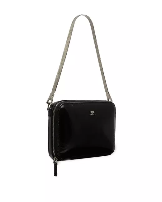 black calf leather patent finish silver-tone logo plaque silver-tone hardware tonal stitching all-around zip fastening detachable leather and chain-link shoulder strap rear patch pocket main compartment internal card slot
