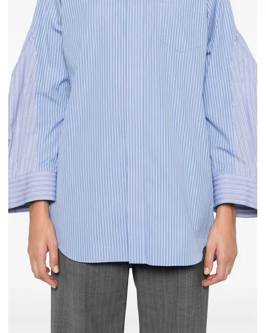 azzurro cotone trama popeline design a inserti motivo a righe verticali abbottonatura frontale nascosta colletto classico maniche lunghe polsini con abbottonatura due tasche laterali dettaglio con piega posteriore orlo curvo