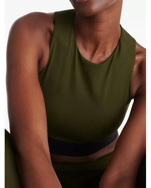 khaki stretch-design fine ribbed embroidered logo to the rear crew neck elasticated underband sleeveless racerback cropped full lining