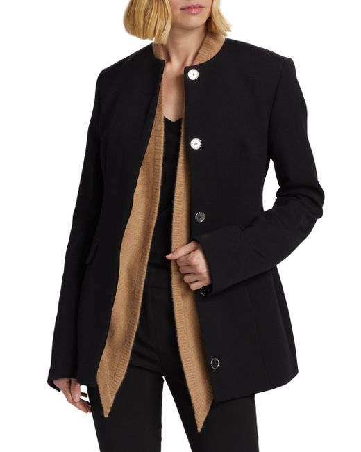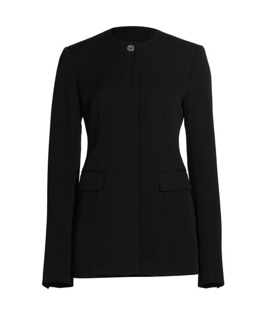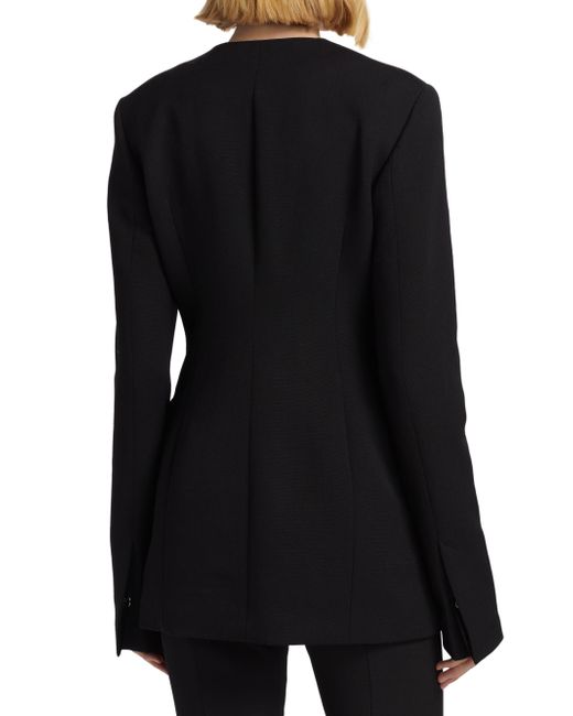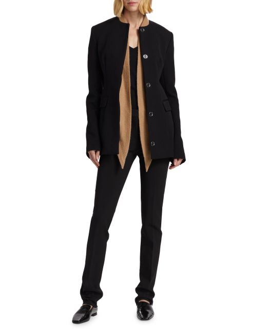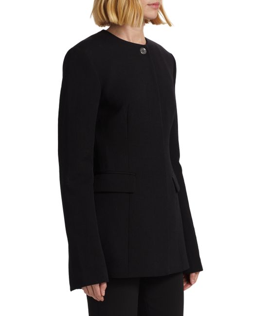 Toteme's suit jacket epitomizes curated tailoring, featuring a slim silhouette cinched at the waist with long darts, a collarless round neck, flap pockets, and a full satin lining. Made with recycled wool Round neck Long sleeves, button cuffs Front flap pockets Button-front closure 60% recycled wool/40% polyester Lining: 100% viscose Dry clean Imported SIZE & FIT Model measurements: 5'10" tall Model is wearing a US size 4. Advanced Designer - Designer Emerging Brands > Toteme > Saks Fifth Avenue > Barneys. Toteme. Color: Black. Size: 0.