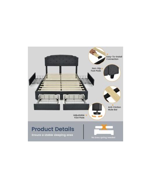 This bed frame comes with a steel frame and two kinds of foot pads (anti-slip and adjustable). The mute bar helps reduce frictions and noises.Also,the whole bed frame is covered with breathable linen fabric.The bed frame also includes four spacious drawers on casters for convenient storage.
