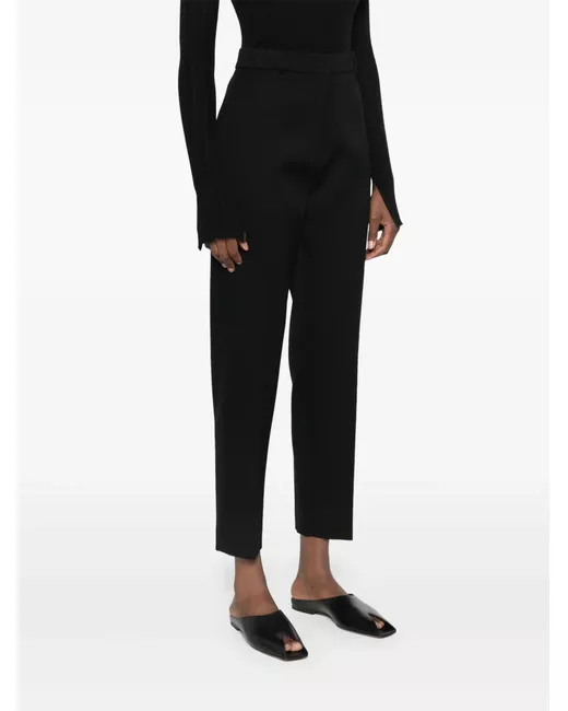 black wool twill weave concealed front button, hook and zip fastening belt loops pressed crease two diagonal pockets to the sides two rear welt pockets tapered leg