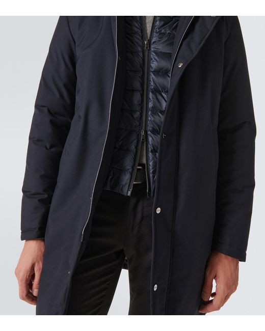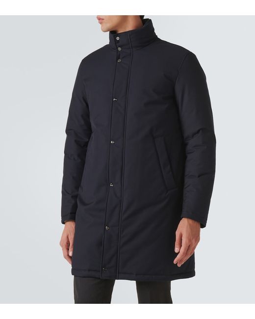 Material: 80% polyester, 20% elastane. Care instructions: hand wash. Made in Romania. Designer color name: Blu Navy. Material II: 100% polyurethane. Lining: 100% polyamide. Filling: 80% down, 20% feathers. Contains non-textile parts of animal origin. Closure: two-way zipped front, snap-buttoned front. Pockets: side slit pockets. Length: long (thigh-length). Sleeves: long-sleeved.