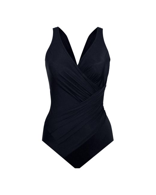 Faux-wrap swimsuit with overlapping ruched panels for a figure-flattering silhouette Surplice neck Sleeveless Scoopback Pull-on styling About 26" from shoulder to hem Nylon/lycra/spandex Hand wash Imported. Outerwear And Swimwear - Modern Swim > Miraclesuit Swim > Saks Fifth Avenue > Barneys. Miraclesuit Swim. Color: Black. Size: 10.