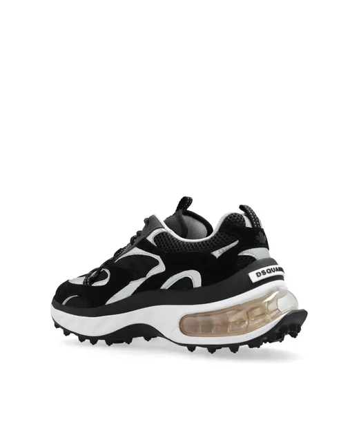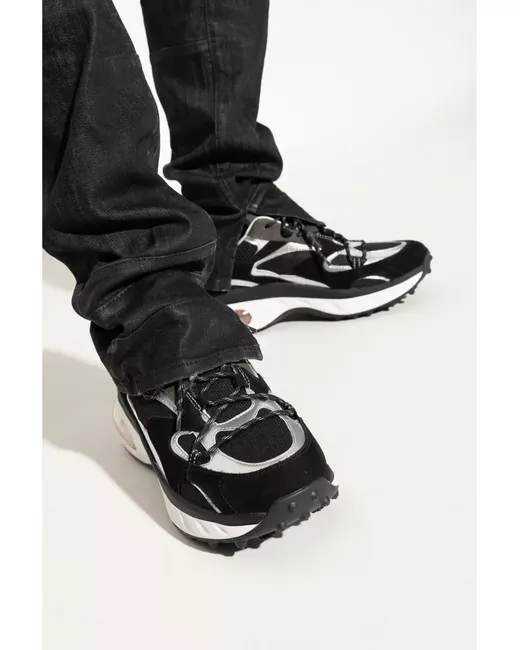 black calf leather front lace-up fastening mesh panelling logo patch at the tongue pull-tab at the heel and tongue round toe chunky rubber sole