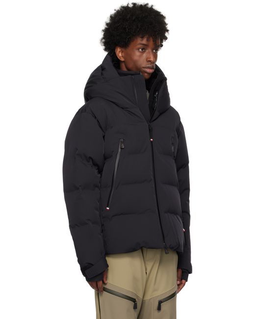 Down-filled and quilted 2L stretch nylon twill jacket. Water-repellent, windproof, lightweight, and breathable. · Bungee-style drawstring at hood · Stand collar · Two-way zip closure · Zip pockets · Concealed bungee-style drawstring at hem · Embroidered logo patch at sleeve · Velcro strap at cuffs · Thumbhole at inset jersey cuffs · Zip pocket and powder skirt at interior · Nylon satin lining · YKK® Aquaguard® hardware Supplier color: Navy blue Fill: 90% goose down, 10% feathers.