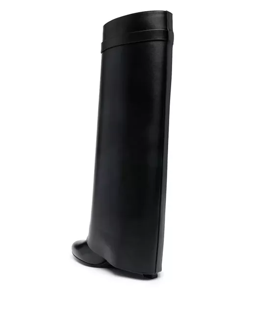 black calf leather smooth grain polished finish panelled design logo-engraved silver-tone hardware signature 4G motif padlock detail almond toe knee-high pull-on style 100mm high wedge heel leather sole