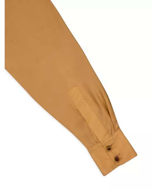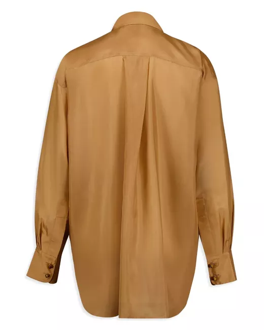 camel brown silk satin weave front button fastening spread collar long sleeves buttoned cuffs curved hem