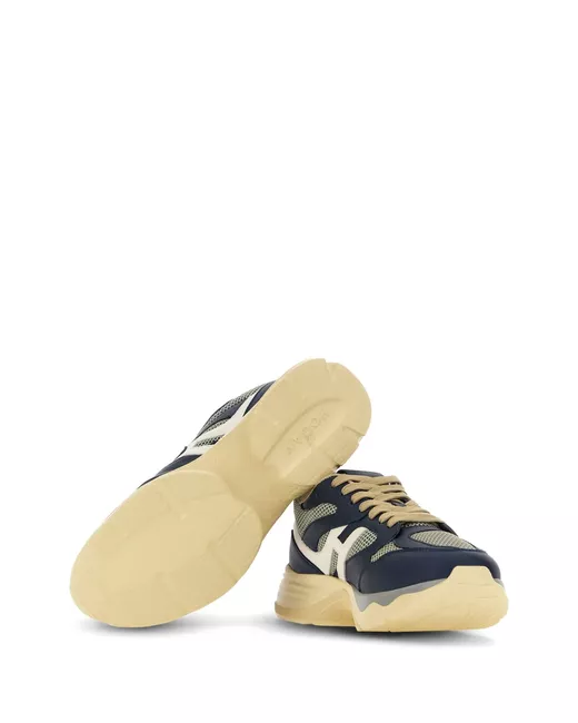 Design a inserti, pannelli in rete, caratteristico logo H, soletta con logo, chiusura frontale con lacci, punta tonda e suola chunky in gomma.