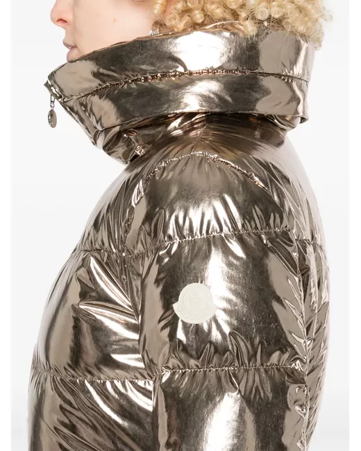 gold-tone metallic effect glossy finish padded design goose down-feather filling front two-way zip fastening concealed hood funnel neck long sleeves logo patch at the sleeve elasticated cuffs two side zip-fastening pockets full lining straight hem