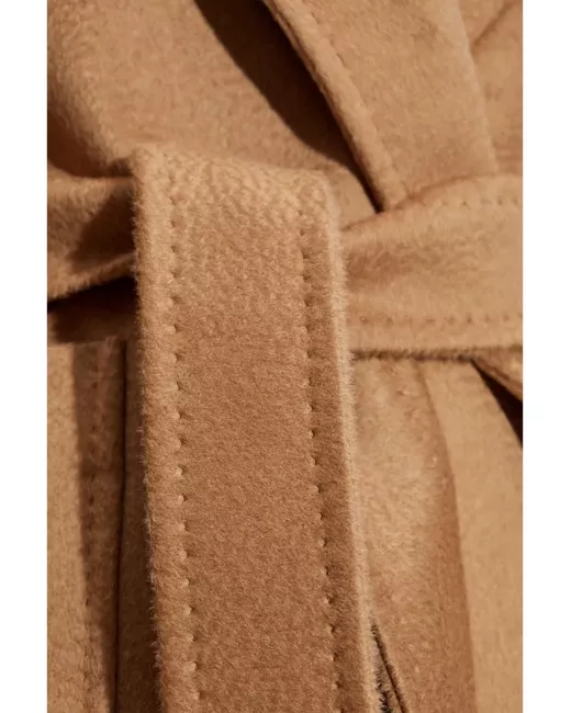 camel brown brushed finish detachable belt classic hood long sleeves two side patch pockets central rear vent logo-jacquard lining straight hem