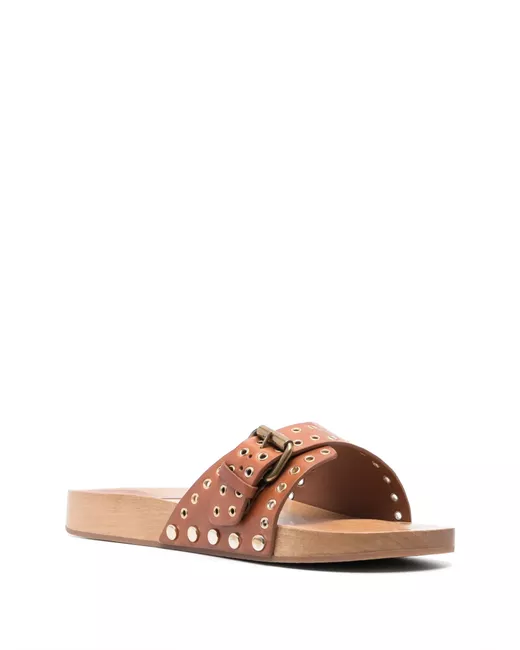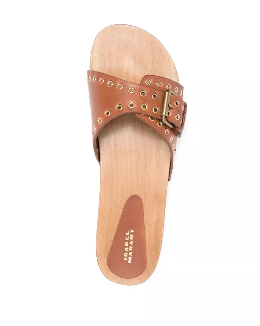 cognac brown calf leather decorative buckle detail eyelet detailing stud detailing open toe branded insole moulded footbed wooden sole