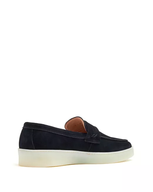 blue suede slip-on style tonal stitching penny slot almond toe branded leather insole flat rubber sole