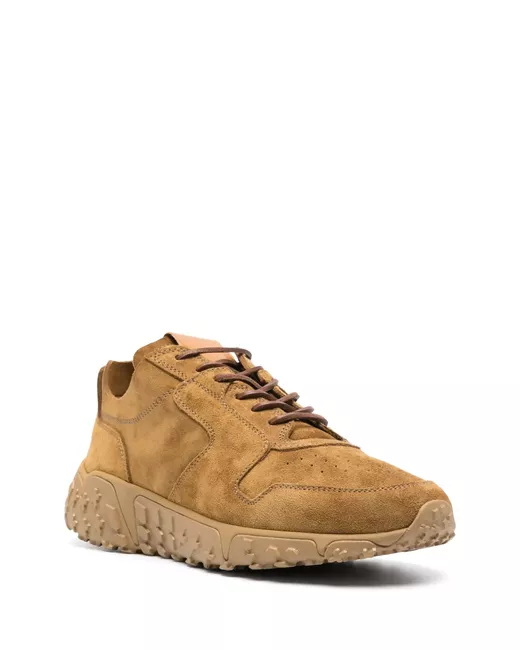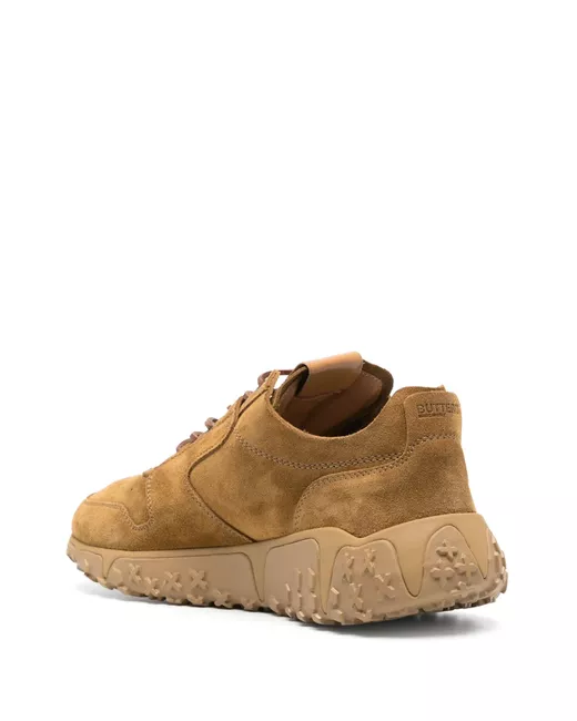 Marrone caramello, pelle di vitello, pelle scamosciata di vitello, logo sul retro inciso, applicazione con logo sulla linguetta, dettaglio traforato, punta tonda, chiusura frontale con lacci, soletta in pelle con logo e suola chunky in gomma.