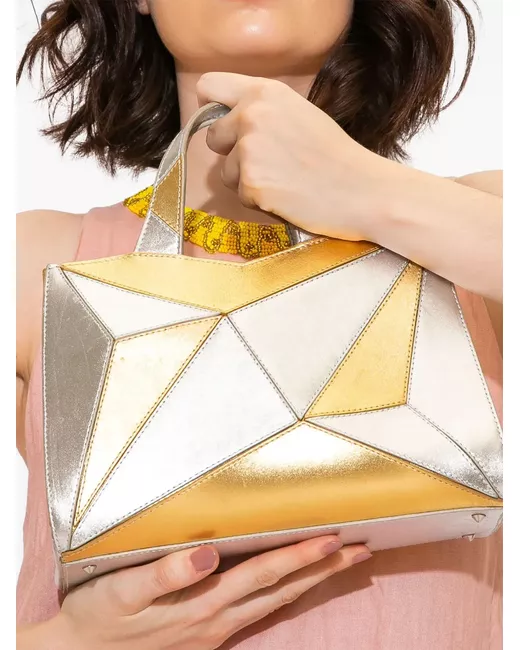 silver-tone/gold-tone calf leather concealed magnetic fastening two flat top handles detachable shoulder strap geometric panelled design main compartment linen lining debossed internal logo internal zip-fastening pocket