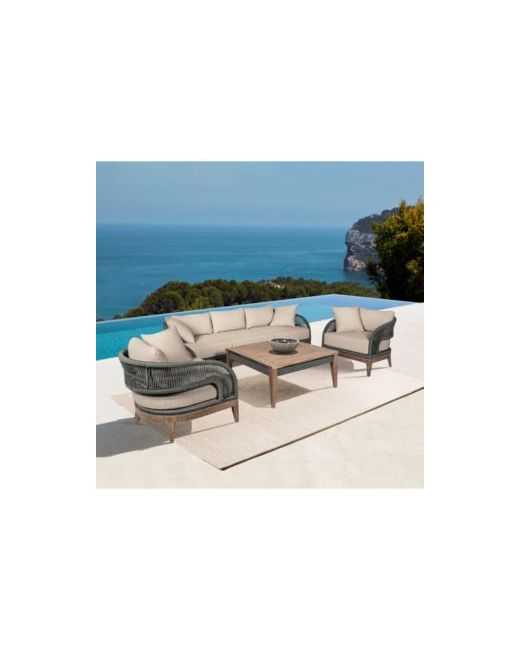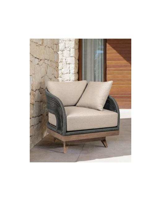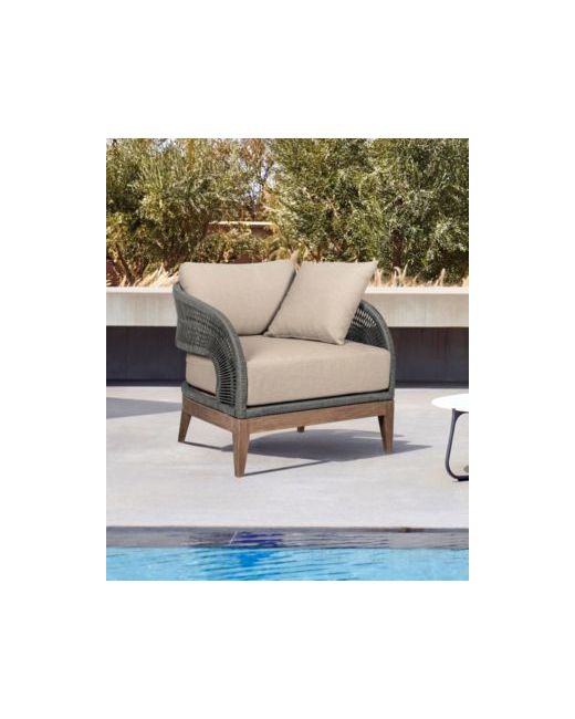 The Orbit Outdoor Swivel Club Chair features a sturdy eucalyptus wood frame, accented with gray rope and plush Olefin upholstered cushions. With a convenient swivel design, this durable chair is built to withstand the elements, providing both comfort and style for your outdoor gatherings.