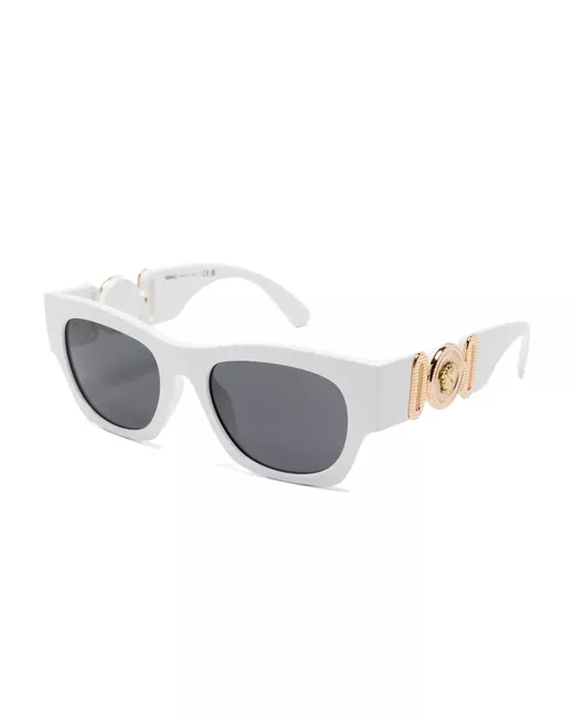 white acetate square frame grey tinted lenses UV-protective lenses logo plaque at the arm Medusa Head motif sculpted arms curved tips These glasses come with a protective case.