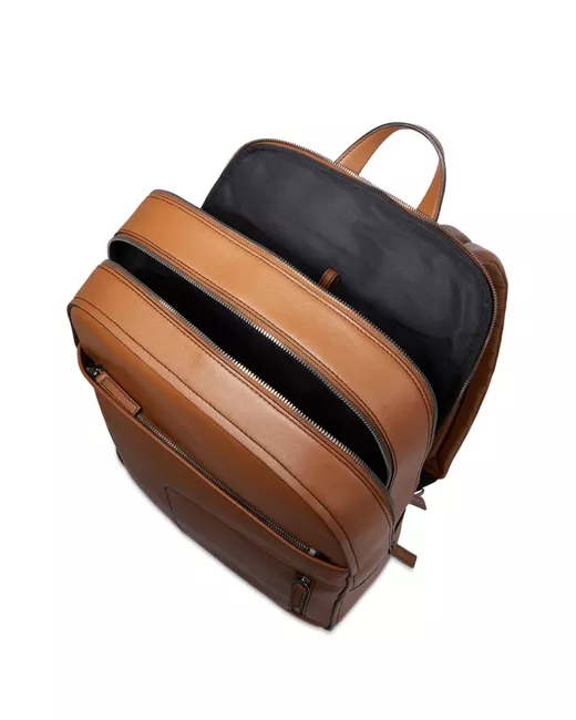 butterscotch brown calf leather smooth grain logo print to the front logo print to the rear padded panels top zip fastening single flat top handle padded adjustable shoulder strap partitioned compartment front zip fastening pockets full lining