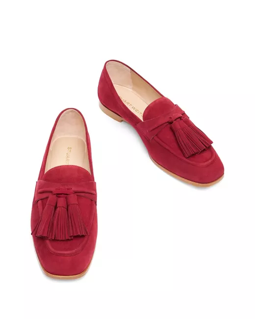 ruby red suede tonal stitching tassel detail apron toe square toe branded leather insole stacked heel leather sole slip-on style