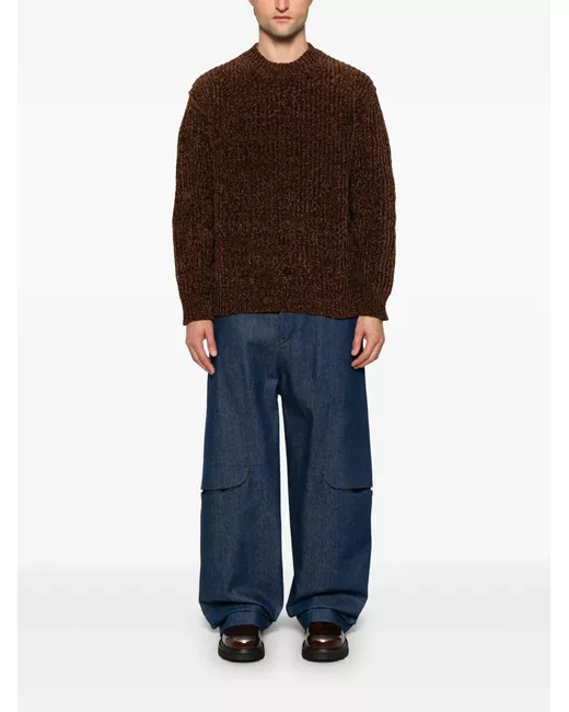 chestnut brown chenille texture ribbed knit crew neck long sleeves ribbed cuffs and hem