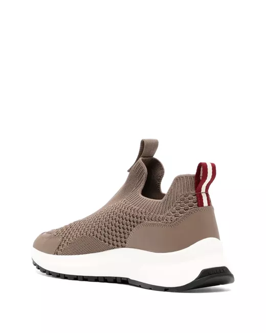 mocha knitted upper leather panelling embossed logo to the side appliqué logo round toe double pull-tab at the opening branded insole chunky rubber sole slip-on style